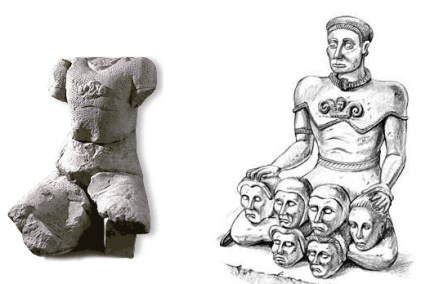 Che si tratti di luoghi legati anche alla rinascita è ben evidente per la presenza di rappresentazioni di spighe di grano, che sono da sempre considerate come simboli di fertilità e di rinnovamento attraverso la reincarnazione. Il tema del culto delle teste tagliate non ha però solo evidenze archeologiche. E’ presente, ad esempio, nella mitologia irlandese. Pensiamo alla saga di Cù Chulainn oppure alla leggenda di Bran il Benedetto il cui cranio, posto sulle colline londinesi, avrebbe protetto la città dalle invasioni, o ancora nella agiografia di san Pancrazio dove si narra del cranio di oro di Cenn Cruaich. Il culto della testa è presente anche nell’Italia del nord-ovest, fortemente caratterizzata da popolazioni celte. Nel museo di Ivrea è conservata una antica testa celto-romana ritrovata nella valle di Corio. Stessa cosa dicasi per la “testa dell’Eroe” (fig.10)