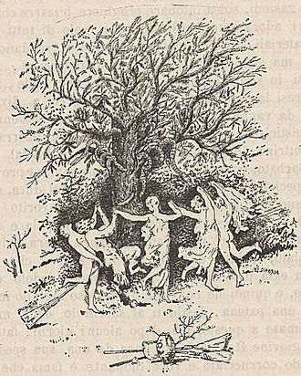 Derivante da Divinità celtiche, forse assorbite nel pantheon romano, come Cernunnos, Pan, Silvano, l’Uomo Selvatico sarebbe stato dunque in compagnia, secondo Donato Bosca, della Grande Madre, data la derivazione delle Masche con le sacerdotesse celtiche che lo scrittore suggerisce.