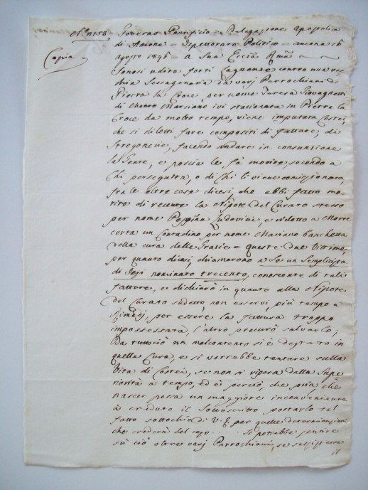 Queste due vittime, per quanto dicesi, chiamarono a se un semplicista di Jesi, nominato Trecento, conoscente di tali fatture e dichiarò in quanto alla nipote del curato suddetto non esservi più tempo a rimedi, per essere la fattura proprio impossessata, l’altro procurò di salvarlo; da tutto ciò un malcontento vi è dettato in quella curia e si vorrebbe tentare sulla vita di costei se non si ripara dalla superiorità a tempo, ed è perciò che pria che possa nascere un maggiore inconveniente ha creduto il sottoscritto portar tal fatto sottocchio di V. E. per quelle determinate azioni che vederà del capo. si potrebbe servire su ciò, oltre che dei parrocchiani, se servisse, anche un tal Vincenzo Banchetta, Mariotti e Maroni.