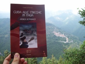 Veduta del borgo di Triora. Di fianco il saggio "Guida alle streghe in Italia" ed. Venexia dove si parla tra l'altro del paese in questione
