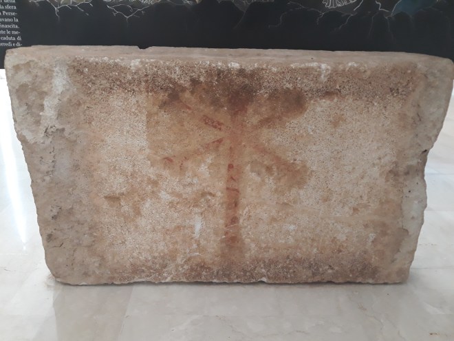 La più antica occupazione dell’area risale al II millennio a.C., periodo che vide nascere le prime rotte commerciali tra il Tirreno, l’Adriatico e il mar Egeo. L’insediamento vero e proprio, datato XVII-XVI secolo a.C. sul promontorio oggi noto come Acropoli era caratterizzato da una serie di capanne e vari siti per la conservazione delle derrate alimentari, dai cereali alla carne. Si doveva trattare, dunque, di agricoltori ed allevatori, ma anche filatori e ceramisti. I veri e propri mutamenti dei villaggi dell’area sono dovuti, però, all’arrivo degli Iapigi, di origine illirica o cretese. Gli storici greci, identificavano spesso la Japigia con la sola Messapia, sia perché gli Japigi parlavano il messapico, sia perché mettevano in relazione l’origine di questo popolo con il leggendario figlio di Dedalo, Iapige, che guidò i cretesi fino a stabilirsi nei pressi di Taranto. La provenienza cretese è anche richiamata anche da Erodoto nella sua narrazione del viaggio di Minosse in Sicilia, alla ricerca di Dedalo. In realtà gli Iapigi si amalgamarono con la popolazione indigena dando origine ai gruppi sopra descritti. E’ in questo periodo che Egnazia diviene un vero e proprio villaggio, con grandi mura difensive, strutture abitative parzialmente murarie, fornaci e luoghi di culto dove si praticavano riti in onore delle divinità ctonie e della fertilità. Troviamo Batas, una sorta di Zeus greco, Thana, assimilabile ad Artemide, Damatra, dea della fertilità il cui culto è richiamato dal ritrovamento di una fiaccola a quattro bracci presente su un lastrone di copertura tombale (Fig.1).