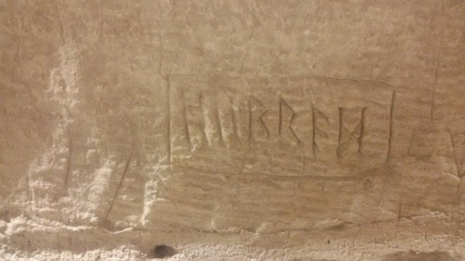 Le numerose epigrafi incise sulle mura del Santuario sono il ricordo indelebile di importanti pellegrini. Quasi duecento iscrizioni, infatti, attestano la presenza di fedeli all’arcangelo tra la fine del VI e la metà del IX secolo. La loro collocazione temporale è varia, brevi frasi, semplici nomi, figure geometriche, rune, croci (fig.1bis), dimostrano una provenienza sociale eterogenea. Troviamo, ad esempio, la “firma” di Romualdo I e del duca Romualdo II (Fig.2) che, con la moglie Gumperga chiedono protezione all’Arcangelo. Compaiono poi, tra le tantissime croci, 97 epigrafi di origine germanica: antroponimi goti, franchi, sassoni, alemanni (Fig.3). Tra le tante iscrizioni se ne possono ammirare alcune anche in runico, non un alfabeto vero e proprio ma un linguaggio di carattere fortemente sacrale e dottrinale che testimonia il passaggio di quelli che potremmo definire i sapienti dell’area nordica. Si tratta di nomi di quattro pellegrini angloassoni che, tra il VII e l’VIII secolo si recarono per devozione nel santuario garganico e ne vollero lasciare traccia. Troviamo così l’iscrizione di Hereberehct (fig.4), quella di di Wigfus, di Herraed ed, infine, quella di Leofwini. La presenza delle iscrizioni runiche getta luce sul legame delle popolazioni germaniche e il culto micaelico e confermano come il pellegrinaggio in Puglia fosse diventato un fenomeno europeo.