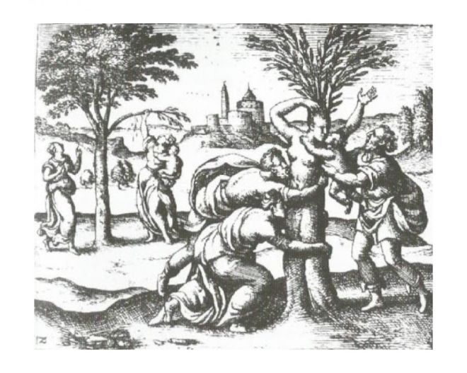 Ecco che però il tema della donna che si rende immanente nell’albero è molto antico, molti asono i miti greci che parlano di queste strane metamorfosi. Pensiamo così a Leuke, inseguita da Ade e trasformata in un pioppo bianco o ancora a Filira, figlia di Oceano e mutata in Tiglio, la virginia Fillide e il mandorlo, per giungere alla già citata Mirra.