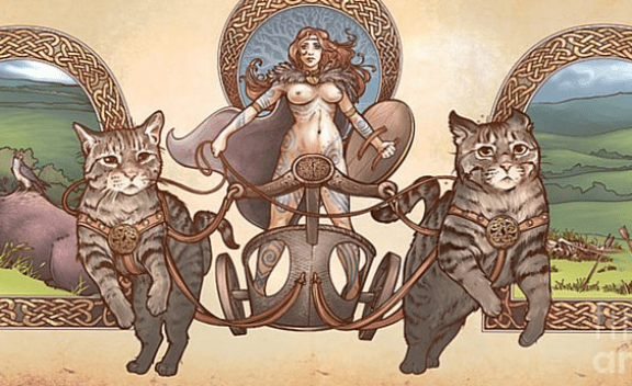 Dall’Egitto ci spostiamo nel mondo nordico. Qui troviamo la dea Ceridwen a cui piaceva tramutarsi in un gatto nero e Freya, dea dell’amore sessuale, della bellezza, della seduzione e della fertilità, che viaggiava su un carro trainato da due gatti volanti, uno maschio e uno femmina, espressione della vita e della morte, del buio e della luce.