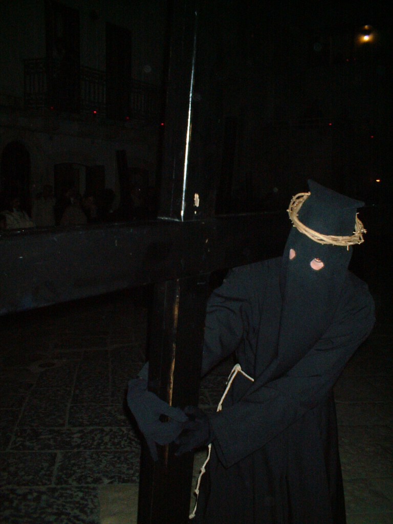 A Noicattaro è il Crocifero più anziano che apre il percorso mentre viene dato fuoco al falò sistemato di fronte al sagrato della chiesa della Madonna della Lama. Sulla parete centrale della piazza viene esposto un drappo funebre su cui sono stampate quattro lettere, P.D.N.I. (Passio Domini Nostri Jesu) mentre un tamburo annuncia la condanna a morte. Tutte le luci del paese vengono spente ad esclusione dei ceri rossi posti sui balconi delle case. Secondo la studiosa Rita Tagarelli, “il suggestivo cerimoniale, che ha il sapore un po’ velato della sacra rappresentazione, è un atto di Fede del popolo nojano”.