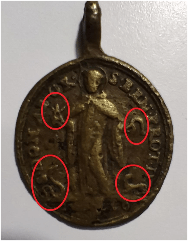 Si tratta di una medaglietta, oramai introvabile, la cui azione terapeutica è ben descritta dal Bellucci “è un amuleto Cristiano, Benedetto, Dalla Chiesa Cattolica è toccato alla reliquia del dente venerata cuculo. le virtù specifiche del muletto sono chiaramente impresse nel rovescio della medaglia: libera dalla rabbia, dal veleno e dal dolore dei denti. Per i fedeli, segnatamente dell’Abruzzo, tale amuleto esercita un’azione preventiva, incontestabile come antirabbico, antinevralgico, contro i veleni degli animali, V per, scorpioni, ragni e tra questi detenute tarantole”.
