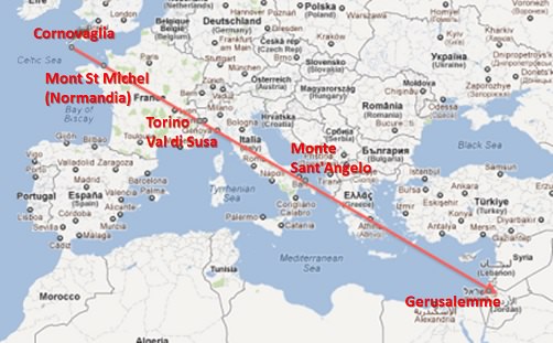 Se si traccia su una cartina geografica una linea che da Mont San Michel, in Normandia, giunge fino al Monte Tabor in Terra Santa, si scoprirà che questa tocca una serie di località legate alla figura dell’Arcangelo Michele come la sacra di San Michele in Val di Susa in Piemonte o Monte Sant’Angelo nel Gargano in Puglia. Secondo un’antica tradizione questa linea rappresenterebbe il cosiddetto “Cammino dell’Angelo” che taglia trasversalmente tutta l’Europa (Fig.1).