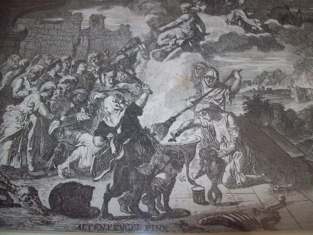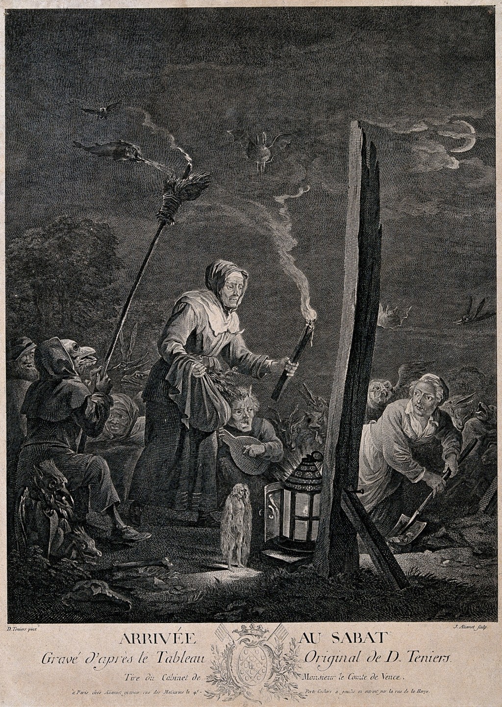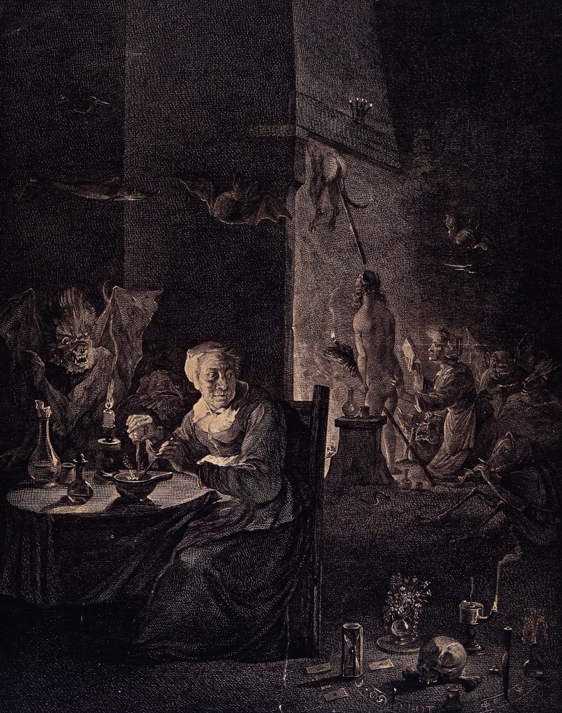 Forse una delle più famose raffigurazioni è l’incisione, su un dipinto oramai perduto di Teniers, di Aliamet. La scena è ambientata in un lugubre interno: in primo piano ecco una strega seduta attorno ad un tavolo intenta a preparare il mistico unguento per il volo assistita da un essere infernale con le ali di pipistrello. Il suo sguardo, perso nel vuoto, è diretto a destra, in basso, ove sono posti oggetti che probabilmente servono per un rito magico. Ecco così raffigurato un cerchio con strani ed esoterici caratteri nel cui centro è posto un teschio umano, vicino, una clessidra, delle carte e dei dadi.