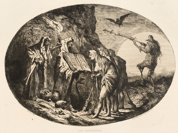 Anche il banchetto orgiastico cambia come nella litografia di Boulanger pubblicata nel 1828 o nella Ronde du Sabbat di Victor Hugo. Un gran caprone raffigurato seduto su un menhir mentre guarda la ridda stregone è invece il tema presente nelle illustrazioni di Emile Bayard per l’Histoire de la Magie del 1870. Pur conservando il senso del meraviglioso l’arte diveniva mezzo per tramutare le conoscenze, per trasformare le feste di campagna, reminiscenza degli antichi culti pagani, in qualcosa di più orrido ed erotico ma che però è divenuto testimonianza del sopravvivere, nel profondo dell’Io di atavici culti mai dimenticati.