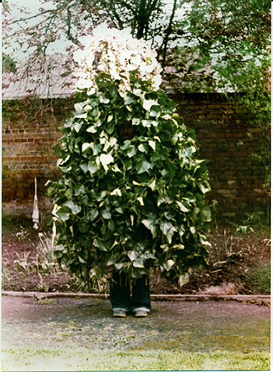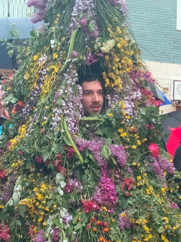 The structure, as mentioned, is made of wood or wicker, covered with woven foliage, including green branches, leaves, and flowers, and is worn on the upper body of a person. It often has a slit in the structure that allows the person inside to see, and the person’s feet may be visible beneath the structure.