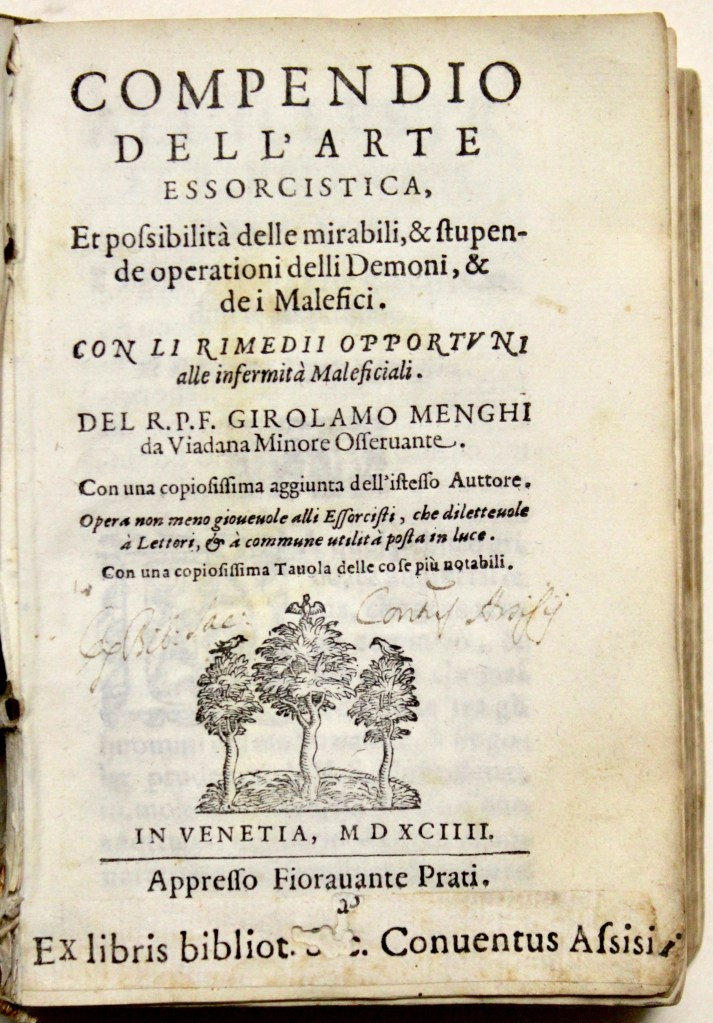 Secondo la tradizione romana, l’esorcista utilizza preghiere, formule prestabilite, gesti, simboli e anche icone, reliquie, oggetti benedetti per allontanare il diavolo. Ebbene, è proprio nel Seicento e nel territorio bergamasco che vengono definiti i primi manuali esorcistici che, tra l’altro, servivano anche per discernere tra i casi femminili di santità o possessione. Il tema dell’esorcismo è antichissimo. Innumerevoli sono le tradizioni magico-religiose dell’antichità in cui sono presenti cerimonie nel corso delle quali gli adepti incarnano entità sovrannaturali. È in questo momento che avviene la discesa di un demone-genio nel corpo del posseduto che diviene giumenta del dio che lo incarna. È l’esser-agito-da, l’unione con l’entità che può concludersi con il suo allontanamento (esorcismo) o con la sua complicità (adorcismo). Se infatti la possessione è una situazione in cui il demone ha il completo controllo della persona che ne è ossessa e lo fa a scopi malvagi, nell’adorcismo il rapporto con l’entità ha finalità positive. Quando parliamo di Demone ovviamente, ci riferiamo al Daimon della tradizione greca, un essere intermedio tra uomo e divinità. Solo successivamente, con la religione Cristiana, esso diviene sinonimo di diavolo. Torniamo alla stregoneria. Nel Seicento inizia a diffondersi l’idea che, proprio come il demone poteva entrare nei corpi, allo stesso modo l’anima umana poteva staccarsi dallo stesso per intraprendere “viaggi” come quelli verso il sabba. Questi due gli argomenti più dibattuti nei manuali di esorcismo tra 500 e ’600. Il più noto è sicuramente il manuale di esorcismi di Girolamo Menghi, membro dell’ordine dei minori osservanti, che tentò di riformare e disciplinare la pratica esorcistica. Egli scrive Fuga daemonum e Compendio dell’arte essorcistica et possibilità delle mirabili et stupende operationi delli demoni et de’ malefici (Fig.3).