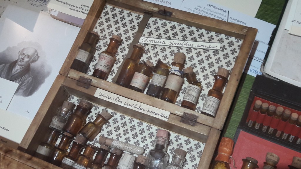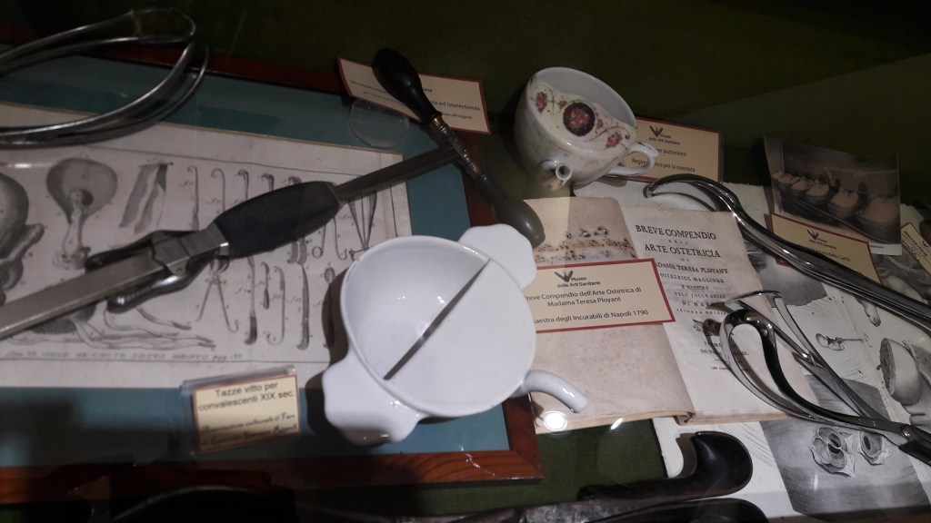 Sono facilmente riconoscibili i punti di sutura e dunque l’immagine dei primi interventi chirurgici, frammisti però alla magia e superstizione. Così l’utero viene ritratto con un diavolo messo di traverso che, secondo l’idea popolare, impediva la normale uscita del feto.In un misto tra chimica e alchemia, dunque, tra meravigliose maioliche, tele e raffigurazioni del Di Fiore come l’allegoria dell’utero virginale, tra vasi in ceramica decorati, ecco che la spezieria vendeva ancora prodotti farmaceutici misti a prodotti legati al mondo del superstizioso come mandibole, ossa e denti di animali.