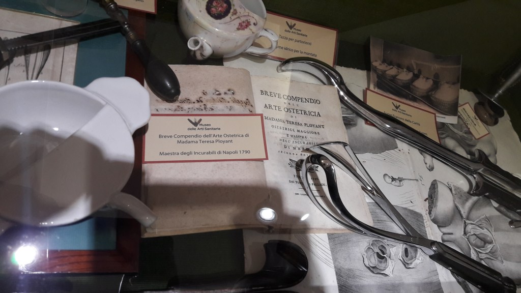 Come detto, dunque, tutto ciò che circondava il parto era legato a magia e conoscenza pratica. Non mancavano eccezioni, ed infatti si deve alla Scuola Medica Salernitana un primo interesse nei confronti di tale argomento da un punto di vista scientifico. Qui doveva operare la prima celebre dottoressa della storia della medicina una certa Trotula o Trottula De Ruggiero, attiva a Salerno nei secoli XI e XII. Non se ne sa molto, alcuni dubitano fosse realmente di sesso femminile, ad ogni modo è a lei che dobbiamo il primo trattato scientifico sull’argomentoDe passionibus mulierum seu de remediis muliebris et eorum cura, che contiene interessanti osservazioni ginecologiche e ostetriche, oltre ai consigli in caso di alterazioni mestruali e all’indicazione di tecniche di protezione del perineo durante il parto. Nel 1596 viene scritto da Scipione Mercurio il primo trattato italiano di ostetricia: La comare o raccoglitrice, anche se è solo nel 1688 che troviamo il primo testo riferibile all’ostetricia moderna scritto da Francesco Mauriceau in lingua francese. Mosche bianche e comunque legate più a teoria che alla pratica. Infatti le donne in Italia non sapevano leggere, figurarsi se avevano la possibilità di studiare libri in latino.Fino al Settecento la teoria e la pratica dell’ostetricia erano, dunque, completamente separate, la prima affidata allo studio scientifico maschile, la seconda alla praticoneria femminile. Nel corso del 1700, sotto l’impulso delle ricerche sull’anatomia sulla fisiologia degli organi genitali, si iniziò a sviluppare, però, una vera e propria scuola medica interessata alla gravidanza e al parto, che porterà alla nascita della figura del chirurgo-ostetrico. Anche in quest’ambito il Regno di Napoli si distingue, in Italia, come fortemente innovatore. E’ qui che nel 1787 nasce la moderna “arte ostetricia” femminile. Per volontà della regina Maria Carolina,nel 1785 giunge a Napoli Teresa Ployant, che divieneostetrica maggiore e maestra presso la sala di maternità degli Incurabili. Pubblica il primo il saggio “Breve manuale dell’arte ostetricia di Teresa Ployant” (Fig.7),