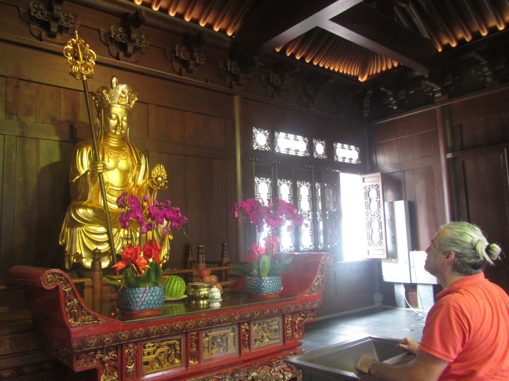 – L’autore dinnanzi la statua del Buddha cosmico Kṣitigarbha. Raffigurato con il Cintāmaṇi nella mano sinistra, il gioiello che esaudisce i desideri e nella destra, un bastone da monaco usato per avvertire insetti e altri piccoli animali del proprio arrivo in modo da non calpestarli inavvertitamente, è quasi sempre rappresentato seduto sopra un loto, a simboleggiare la sua liberazione dal Saṃsāra.