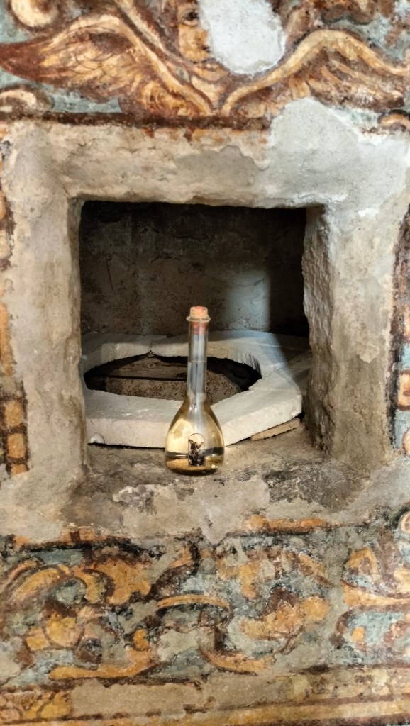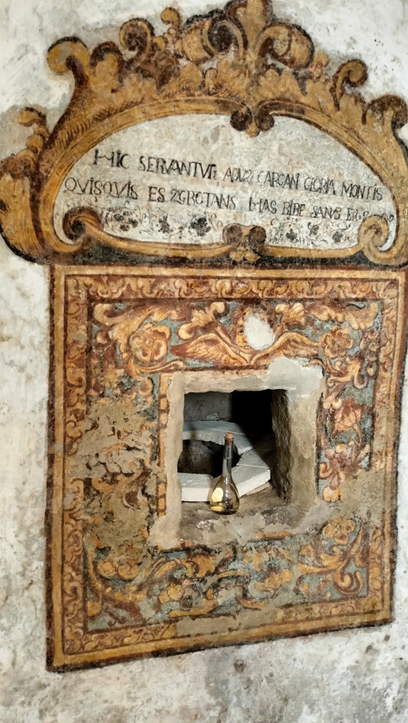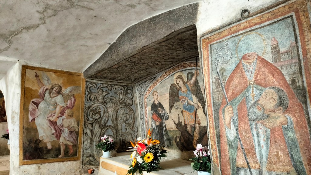 A confermare l’antichità del luogo, si trovano ancora tracce di affreschi nella cosiddetta grotta D, che probabilmente fungeva da sagrestia. Ogni elemento architettonico e simbolico di questa cripta sembra dialogare con una spiritualità antica, dove il culto di San Michele, protettore delle alture e delle caverne, si intreccia con il paesaggio carsico e con le radici orientali della fede.