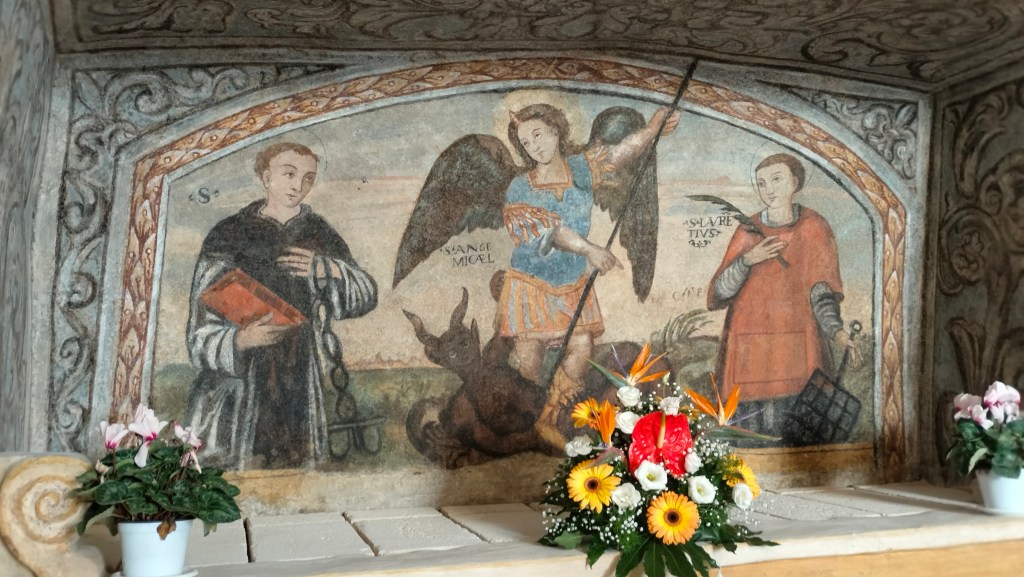 A sinistra di San Michele c’è un santo vestito con abiti monastici neri e un libro rosso, con l’etichetta “S.” (probabilmente per “San”) vicino alla sua testa. Potrebbe un santo monastico, con in mano delle catene. Potrebbe essere identificato come San Pietro da Verona (San Pietro Martire), membro dell’Ordine dei Domenicani, spesso rappresentato con delle catene e un libro, riflettendo sia il suo ruolo di predicatore che il suo martirio. A destra di San Michele c’è un altro santo con una tunica rossa, che tiene una palma del martirio e una graticola. L’etichetta accanto a lui recita “S. LAURENTIVS”, ovvero San Lorenzo ed infatti la graticola è un riferimento al suo martirio.
