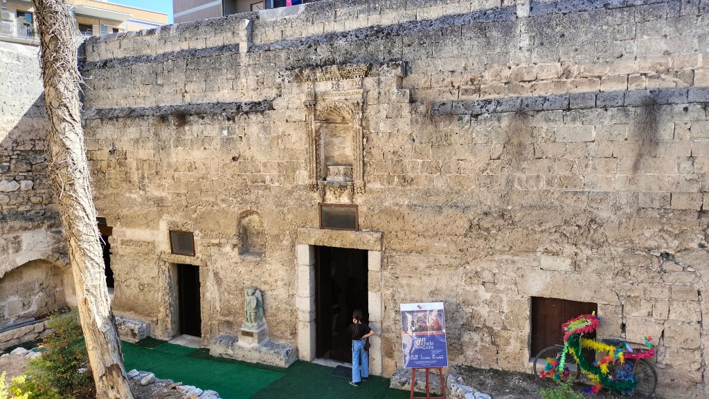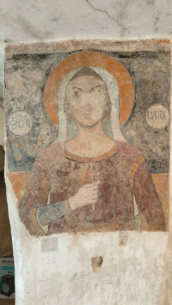 Ma è il corpo stesso della cripta a raccontare la sua storia. Scavata interamente nella roccia, si compone di tre navate sorrette da cinque pilastri quadrati, e si distingue per una struttura massiccia e severa, con una grande volta piatta e bassa. L’accesso avviene tramite una doppia scalinata che conduce a due ampie grotte (identificate come C e D nella planimetria antica), un tempo affrescate e ornate di icone. Oggi rimangono solo poche tracce pittoriche, ma resistono due affreschi secenteschi raffiguranti Santa Lucia e San Nicola, testimoni di una devozione popolare mai interrotta.