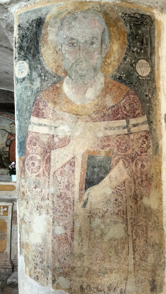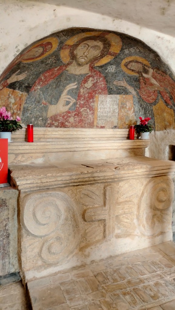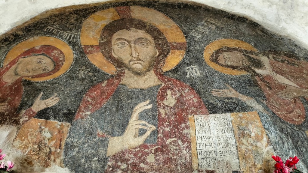 Particolarmente significativo è poi l’affresco absidale dell’altare principale, con un Cristo Pantocratore, affiancato dalla Madonna e dal Battista. L’opera, seppur ormai databile tra XIII e XIV secolo, conserva chiari influssi italico-bizantini, elementi che rafforzano l’ipotesi di una lunga fase iniziale di vita greco-orientale del luogo.