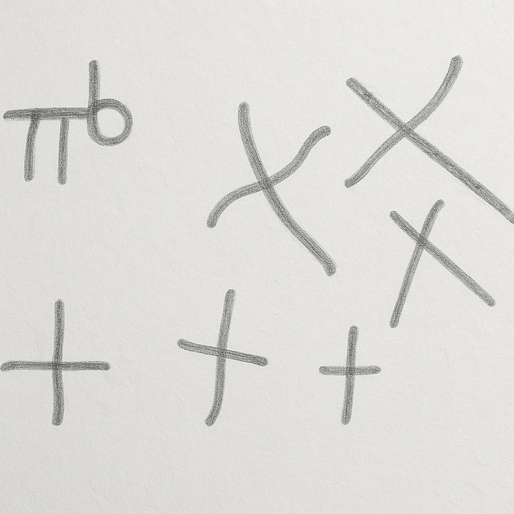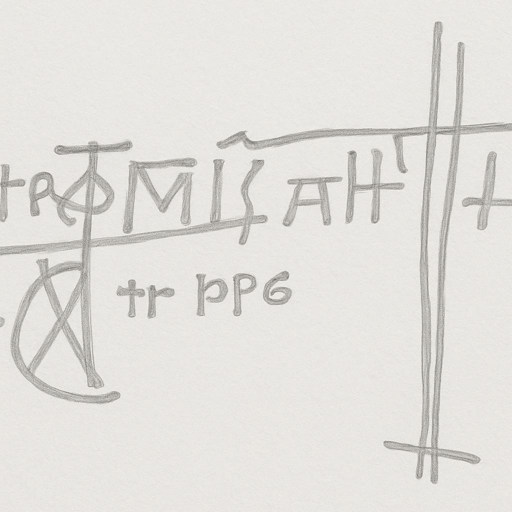 Le lettere centrali sembrano formare la scritta “MIHT” o “MIHTY”, letta orizzontalmente. Potrebbe essere una traslitterazione latina (da un contesto cristiano) simile a “MIHI” (per me) o “IN MIHT” → “in forza / per virtù”. Le lettere a sinistra ricordano l’unione tra XP (Chi-Rho), simbolo del Cristo vincitore, con elementi stilizzati che possono richiamare le lettere greche o latine. In basso a sinistra è presente poi un glifo che combina croce, mezzaluna e Chi-Rho, simile a quelli visti nei graffiti paleocristiani o bizantini. In basso al centro vi è poi il simbolo “π + tp6” che potrebbe essere una formula codificata, e che ricorre spesso anche in altre aree, forse numerologica o alfabetica, in cui: “π” può simboleggiare l’eternità o la perfezione geometrica. Questa iscrizione, insomma, sembra costruita con una logica magico-apotropaica cristiana. Potremmo trovarci, dunque, di fronte a una preghiera visiva o invocazione di protezione, in forma simbolica.