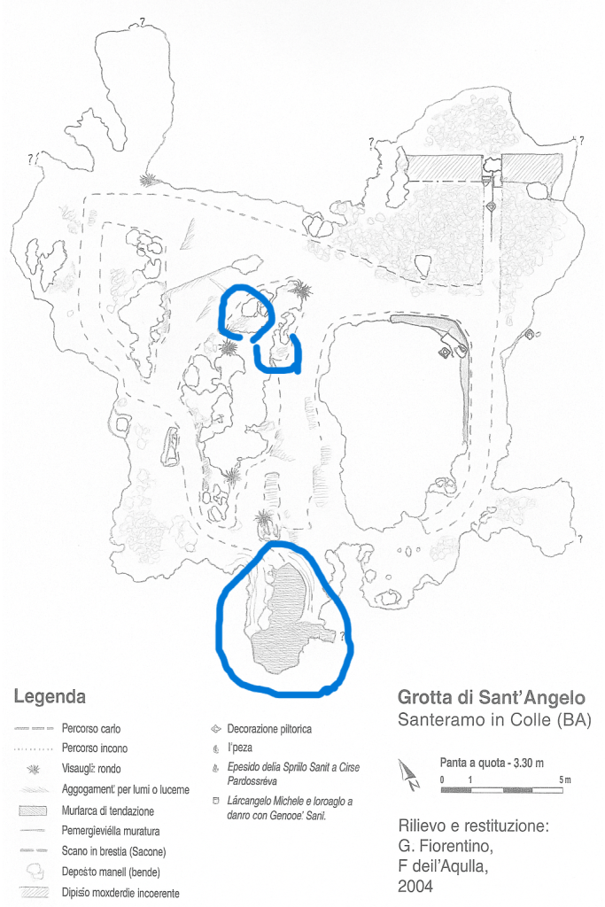 L’immagine evidenziata sotto, tratta dal rilievo del 2004 di G. Fiorentino e F. dell’Aquila, mostra la planimetria dettagliata della Grotta di Sant’Angelo a Santeramo in Colle (BA), uno dei luoghi rupestri più significativi per lo studio del culto micaelico in ambito rupestre. Le zone cerchiate in azzurro corrispondono a depressioni naturali o artificialmente scavate che ospitano pozze d’acqua, identificate nella legenda come vasche d’acqua.