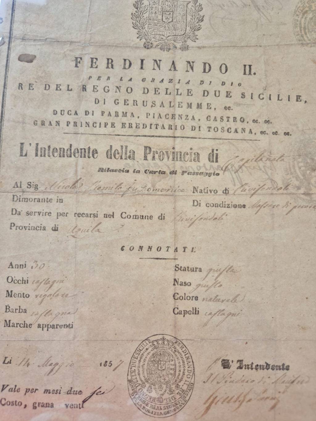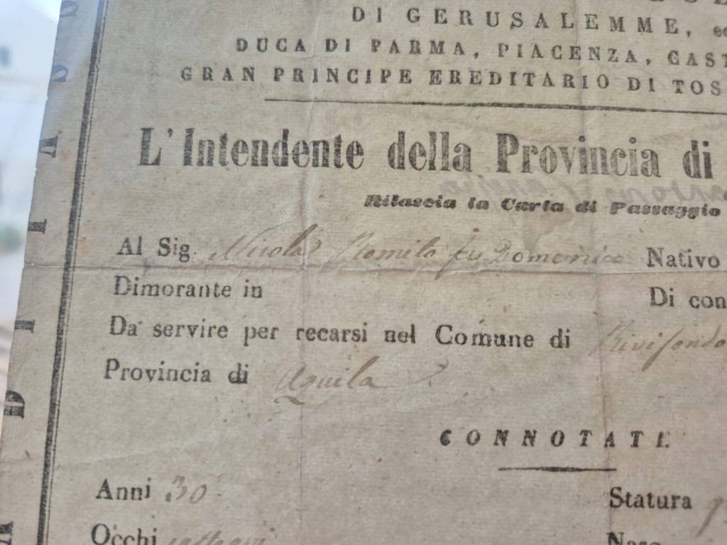 Per ottenere la Carta di Permesso, i pastori dovevano rivolgersi alle autorità locali, come l’intendente della provincia abruzzese da cui partivano. L’intendente verificava l’identità del richiedente e, in base alle informazioni fornite, rilasciava il permesso. Questo documento, come molti altri dell’epoca, includeva dettagli personali del richiedente e veniva autenticato con un sigillo ufficiale.