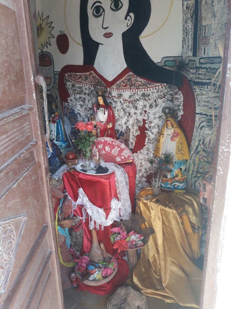 Fig.1 – Altare domestico dedicato a Santa Barbara sincretizzata con Shango e a Yemanja. Tra le offerte a tali divinità si possono vedere ceri votivi, fiori e frutta.