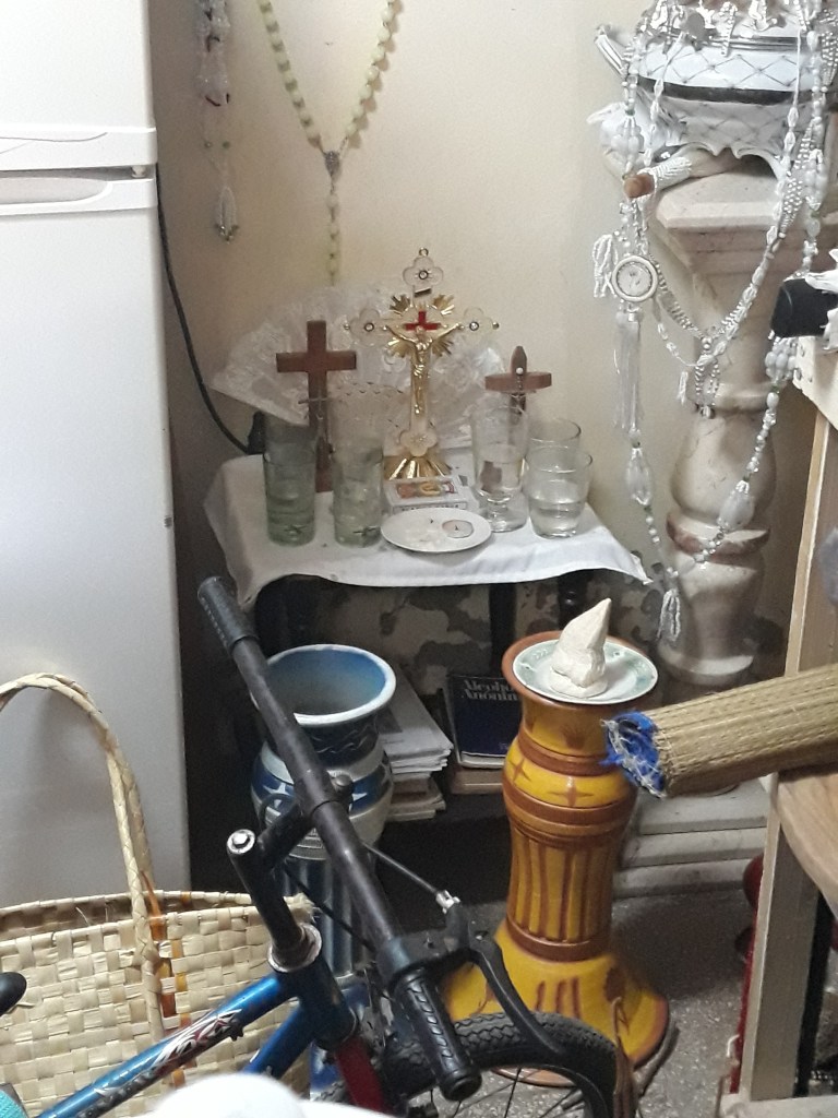 Fig.4 – Un altare dedicato agli Orishas presente in una abitazione di Trinidad. L’altare si sviluppa su tre livelli: quello più basso è dedicato agli spiriti dei defunti o Egungun e ad Elegguà, quelli superiori a divinità più “benevole”. In particolare in foto l’altare è dedicato a Shango