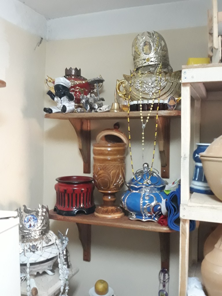 Fig.3 – Altare dedicato ad Ashun. In particolare le Entità degli Orishas in questo altare sono cultuati sotto forma di “zuppiere”o sopera.Le Entità dimorano questa sorta di feticcio di creta che diviene una sorta di regno in miniatura degli Orishas ed in particolare dello specifico Santo venerato che si fa immanente nel mondo-zuppiera. Proprio per questo la natura e il materiale della stessa varia a seconda dell’Orisha di riferimento, Exù preferisce sopiere in argilla, Ogum un calderone in metallo, quelle di Yemanjià devono esser di colore bianco e blu, mentre i gemelli Ibeji ne preferiscono due piccole.