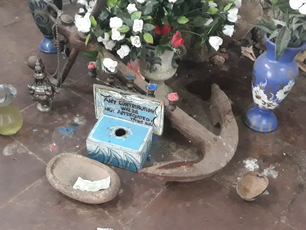 Un fulmine di latta, una spada, pesos dentro un catino di plastica, collanine fanno da offerte ad una statua di Cristo (Fig.2). Una piccola testa realizzata in cemento, rappresentante Elegguà, è poi sempre presente ai piedi dell’altare (Fig.3-4-5).