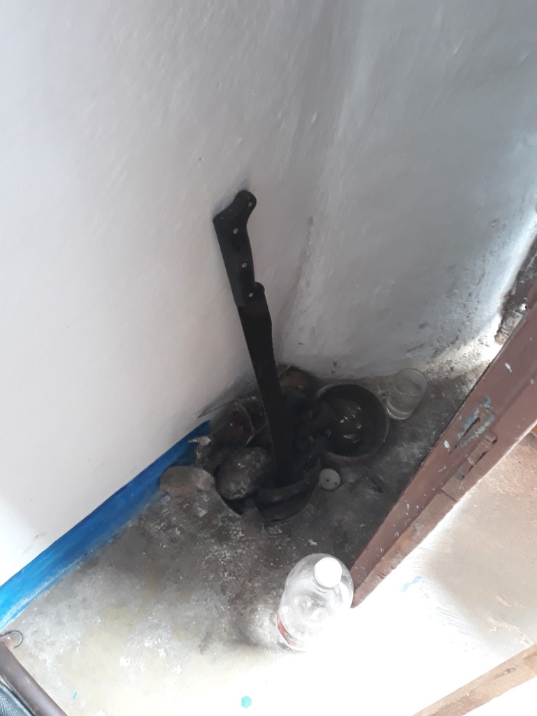 Fig.11 – Particolare della parte più “bassa” dell’altare dedicata ad Elegguà. In particolare si possono notare i bastoni a “L” tipici della raffigurazione di Elegguà come un vecchio. Al centro la “sopera” che nel Palo prende nome di Nganga