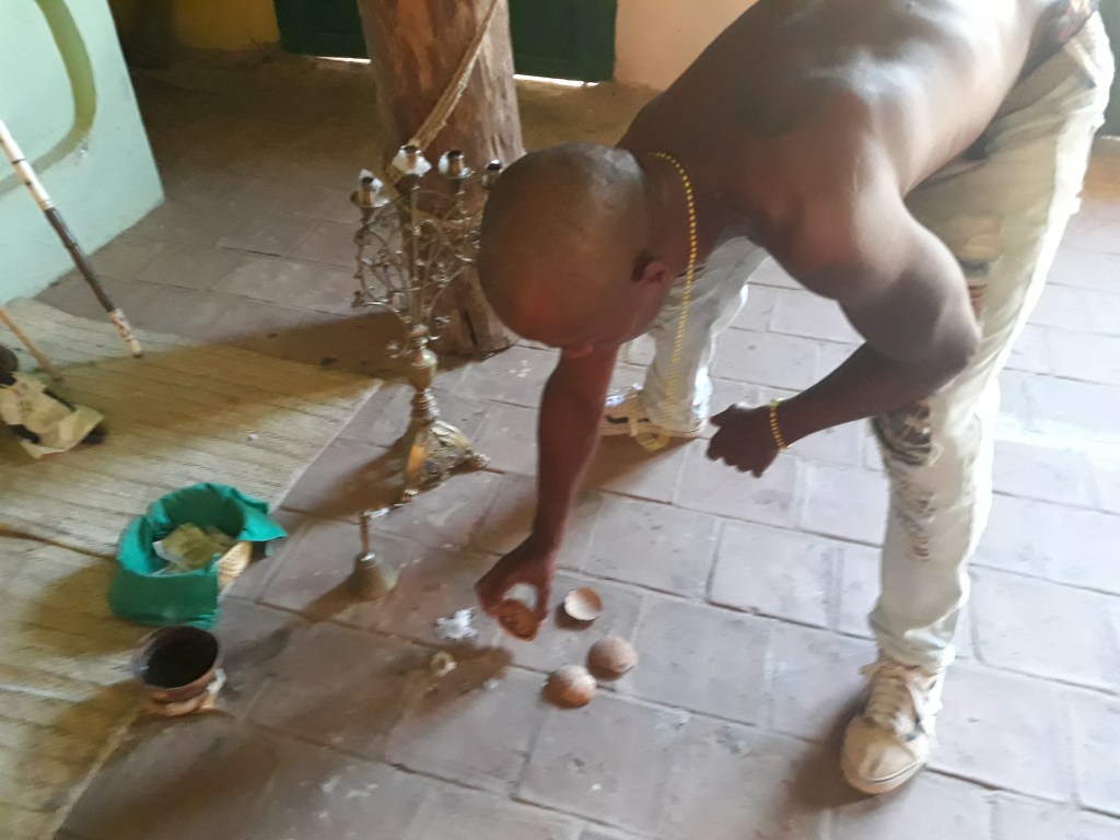 Fig.9 – Un Palero mostra la lettura dei Buzios una delle più antiche pratiche divinatorie diffuse in Sud America e soprattutto a Cuba. Il tramite è costituito da gusci della noce di cocco di Elegbarà